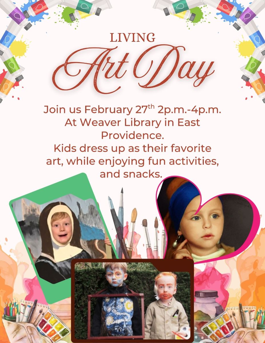 Join us at Weaver Library in East Providence for Living Art Day on 2/27 from 2 p.m.-4p.m. Kids are asked to come dressed up as their favorite art or Artist. Whether its Picasso or Pochade, we want them to show off their creativity! Bring a small poster or Print out about your art or Artist to share with the others! We invite other Enrich members to come by and check out the art as well and support the kids! Snacks and activities will be available. Open to ages 6-18, but little siblings are more than welcome to tag along! Event is free to members. There is parking in the front of the library as well as a small parking lot behind the library you can access from the road behind. |
